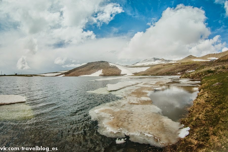 Когда мы вышли на дорогу, нам не пришлось долго ждать. К озеру мы поднялись с девушкой Ануш и ее дядей. Они очень удивились тому, что мы путешествуем автостопом и пригласили нас на шашлыки. У озера было больше снега, чем мы могли подумать. Воздух был холодный, но солнце согревало нас. Это озеро называется Кари. Даже сейчас оно было покрыто снегом и льдом. Оно расположено на высоте 3207 м над уровнем моря.